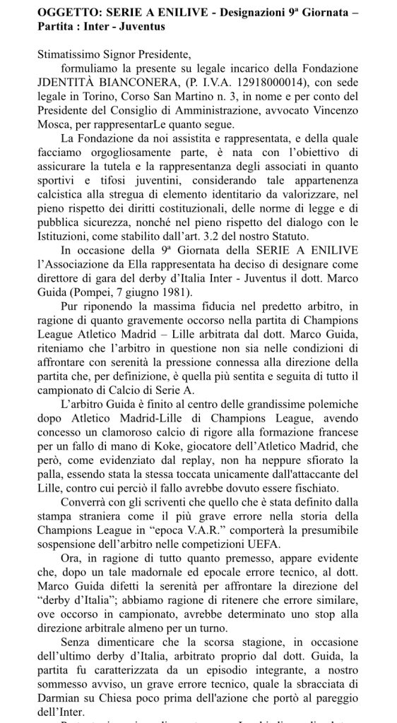 Stimatissimo Signor Presidente, formuliamo la presente su legale incarico della Fondazione JDENTITÀ BIANCONERA, per rappresentarLe quanto segue. La Fondazione da noi assistita e rappresentata, e della quale facciamo orgogliosamente parte, è nata con l’obiettivo di assicurare la tutela e la rappresentanza degli associati in quanto sportivi e tifosi juventini, considerando tale appartenenza calcistica alla stregua di elemento identitario da […]
