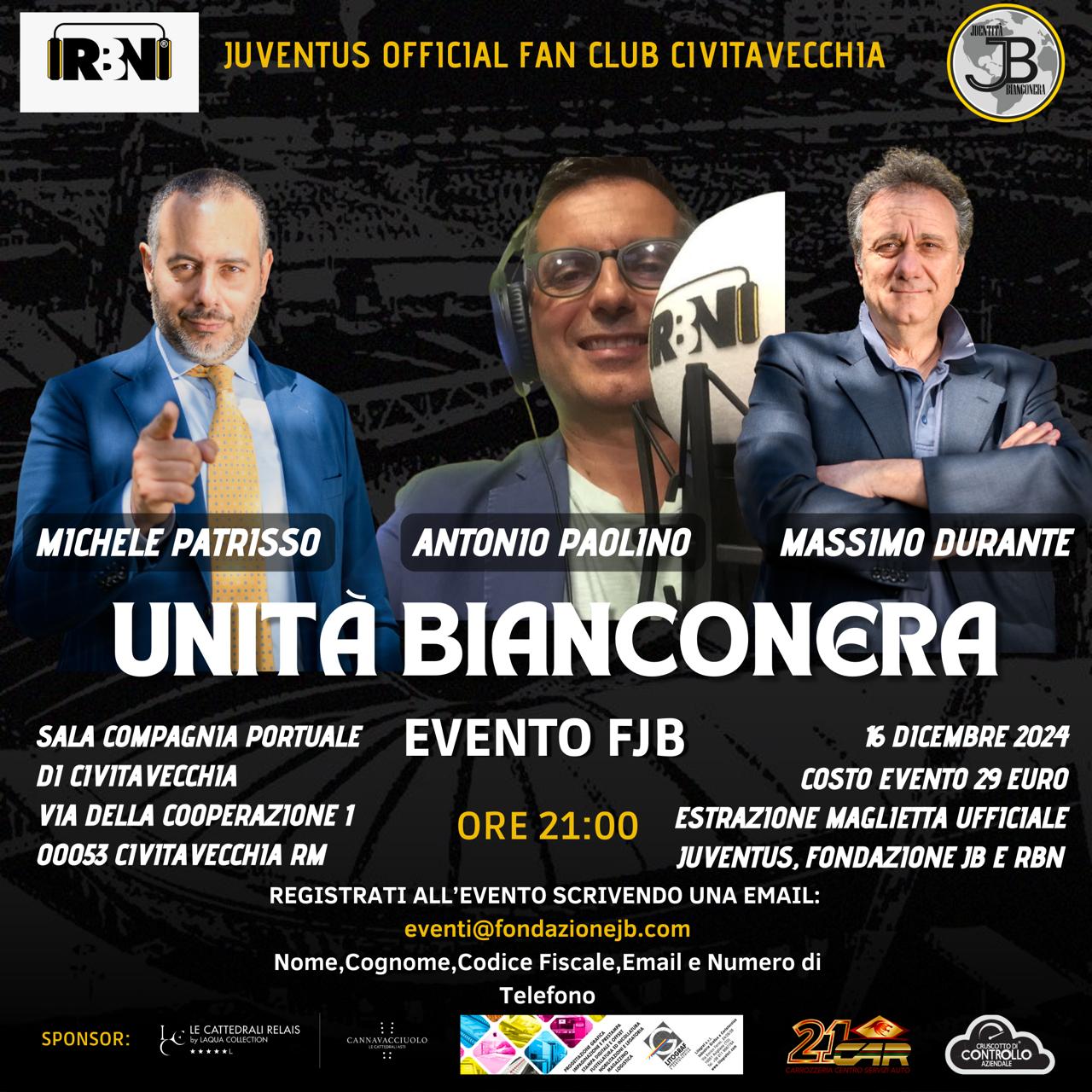 Un lunedì di festa, rigorosamente in bianco e nero, a Civitavecchia. Serata di gala per tutti gli appassionati della Vecchia Signora, con un evento da non perdere. Lo Juventus Official Fan Club Civitavecchia celebra infatti con il punto esclamativo i dieci anni di attività e lo fa con una serie di kermesse di assoluta rilevanza. A partire dalle ore 21:00 di lunedì 16 dicembre, presso la Sala della Compagnia Portuale di Civitavecchia, sita in via della Cooperazione 1, si svolgerà infatti l’evento “Unità Bianconera”, appuntamento allestito a “sei mani” in collaborazione tra lo Juventus Club locale, Radio Bianconera e la Fondazione JB. Alla presenza delle figure di maggior rilevanza delle tre realtà, comprese le figure rappresentative di Rbn tra cui Alessandro Santarelli, Enzo Marangio e il direttore Antonio Paolino, del presidente della Fondazione JB Massimo Durante, del direttore Simone Brancozzi e del responsabile del team legale Michele Patrisso, verranno toccati temi tanto cari ai tifosi della Juventus. Sarà l’occasione per raccontare le iniziative compiute dalla Fondazione JB nel suo primo anno di attività, interagire con grandi professionisti dei rispettivi settori e celebrare doverosamente una partnership duratura tra Radio Bianconera e la Fondazione. Occasione propizia per tanti tifosi per conoscere a fondo tutto ciò che è stato fatto e quanto ancora verrà fatto per supportare e proteggere i colori del club più titolato d’Italia. Per partecipare all’evento occorre registrarsi scrivendo una mail a eventi@fondazionejb.com inserendo nome, cognome, codice fiscale, e mail e numero di telefono. Fino alla fine … ma è solo l’inizio.